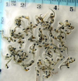 All of the programs of the San Juan Islands Marine Monitoring Network have plankton-monitoring teams; the oldest one has been documenting plankton assemblages year-round in Cowlitz Bay since 2006. They differ in oceanographic settings and focus, however. In Eastsound and Fisherman Bay, the focus has been harmful algal blooms. Our Community Salmon Teams have focused on zooplankton prey of salmon and forage fish. In 2012, we began harmonizing plankton collection throughout the Network to ensure that some basic biomass and species data are standardized and comparable across monitoring sites. Next, we designed special sampling gear to address a "missing link" in Salish Sea plankton data sets: larval fish (ichthyoplankton), which we have periodically observed in large numbers in mid-winter experimental trawls over deep waters between the islands. Complementing these new larval fish data, we have begun sampling the gut contents of Pacific Sandlance and Pacific Herring collected in nearshore seines and spawning areas.